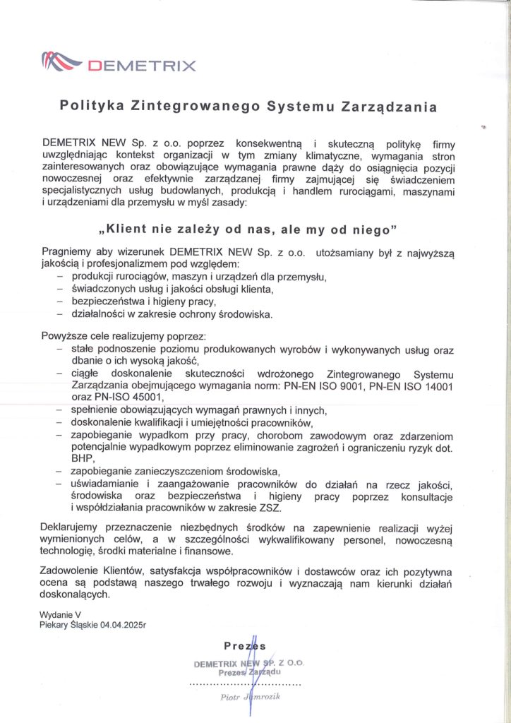 Dążymy do osiągnięcia pozycji nowoczesnej oraz efektywnie zarządzanej firmy. Wizerunek firmy ma być utożsamiany z najwyższą jakością i profesjonalizmem, dlatego stale podnoszony jest poziom produkowanych wyrobów oraz wykonywanych usług.